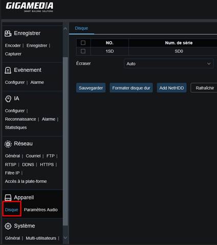 La première chose à faire lors de la configuration d’une carte SD est de la formater. Pour cela, allez dans Appareil → Disque