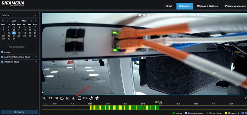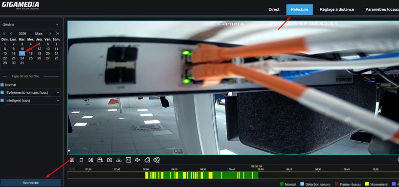Une fois les paramètres terminés, votre caméra commencera ses enregistrements. Pour les consulter, rendez‑vous dans l’onglet « Relecture », sélectionnez le jour souhaité puis cliquez sur « Recherche » : vous accéderez alors aux enregistrements de votre caméra.