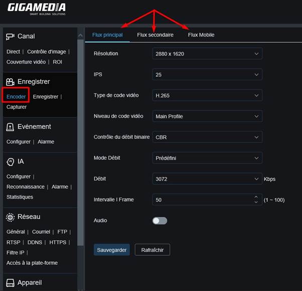 Une fois la carte formatée, vous pourrez modifier le format d’enregistrement dans Enregistrer → Encoder. Cette page permet de régler la résolution, le débit et le type d’encodage. Ces paramètres influent sur la taille des enregistrements : plus la qualité est élevée, plus les fichiers occuperont d’espace.