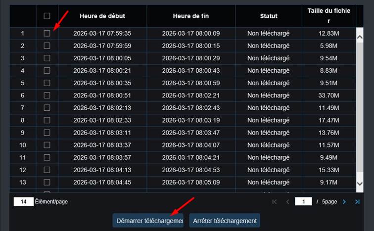 Une page s’ouvrira alors et affichera les enregistrements disponibles. Sélectionnez les plages horaires qui vous intéressent, puis cliquez sur « Démarrer téléchargement » pour enregistrer les fichiers sur votre appareil.