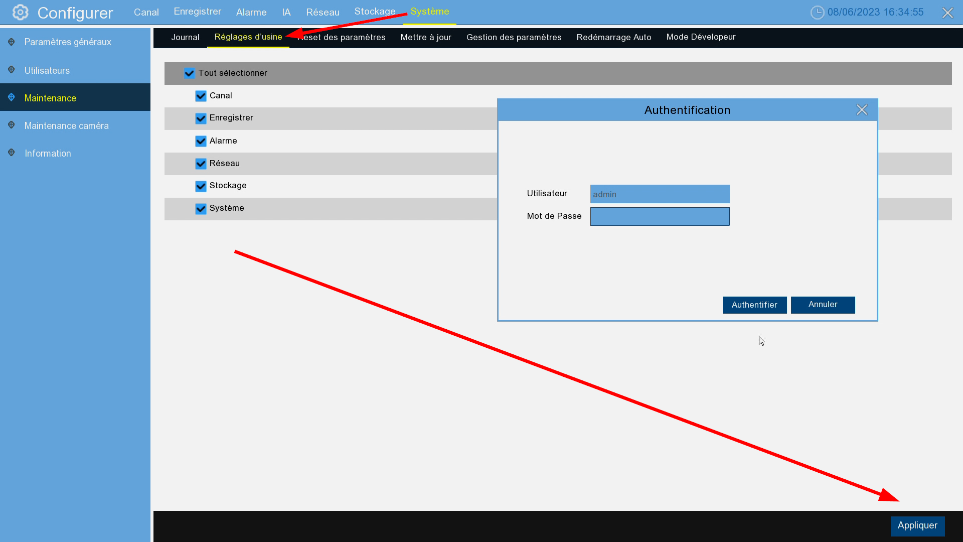 Ensuite appliquer, puis entrer le mot de passe, l'enregistreur va redémarrer.