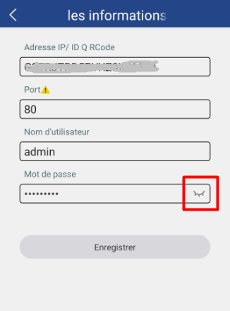 Astuce : Si vous avez oublié votre Mot de passe, vous pouvez afficher celui-ci en trouvant le pictogramme "œil" sur le champ : Mot de passe
