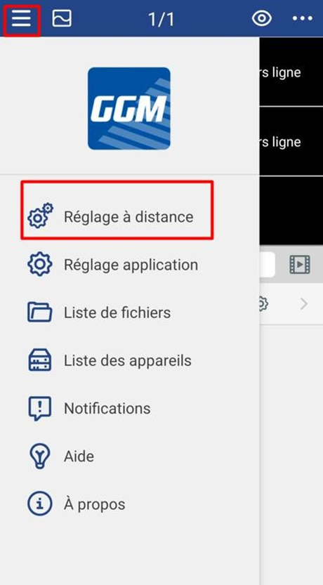 V aplikaciji GGM View (na telefonu) kliknite na ikono zgoraj levo, nato pojdite na "Oddaljene nastavitve".