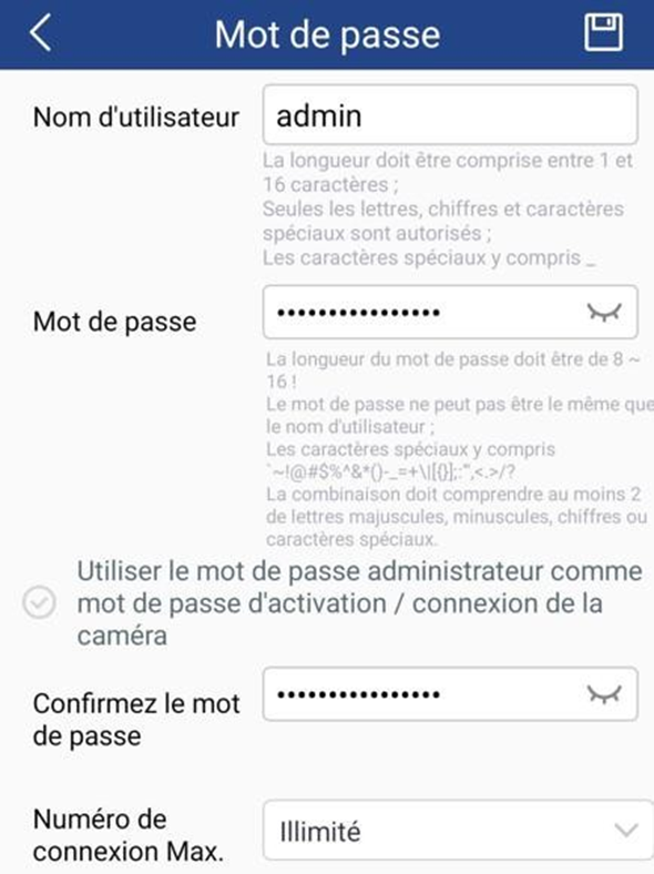 - Potrditveno polje za uporabo gesla za ta račun (samo upraviteljski račun) na že dodane kamere.